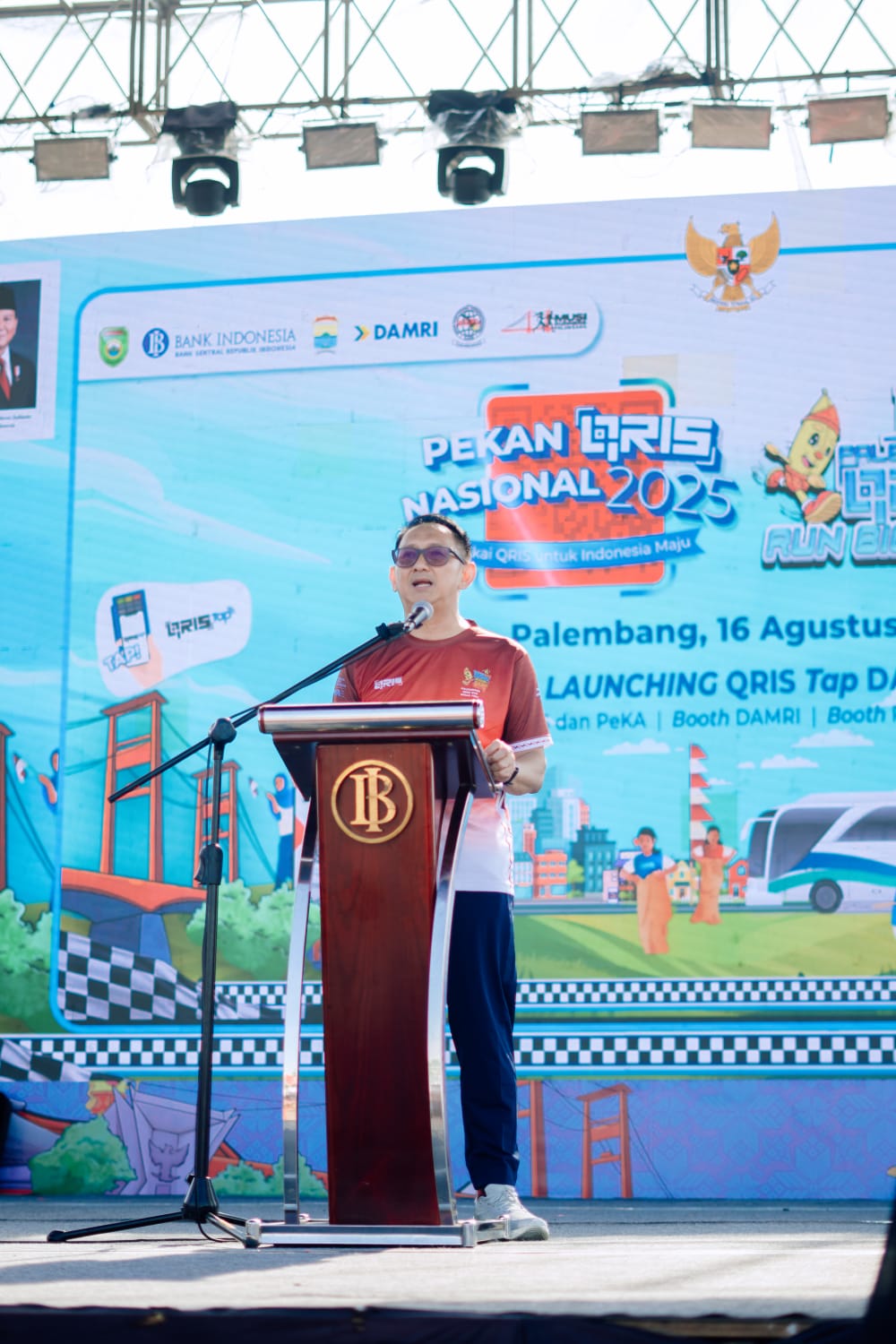 SUARAPUBLIK.ID, PALEMBANG – Dalam rangka memeriahkan Pekan QRIS Nasional (PQN) 2025, Kantor Perwakilan Bank Indonesia Provinsi Sumatera Selatan menyelenggarakan Palembang QRIS Run Bidar Fest 2025 yang dirangkai dengan peresmian QRIS Tap MPos DAMRI. Acara yang berlangsung di Benteng Kuto Besak (BKB) Palembang ini dihadiri oleh Wakil Gubernur Sumatera Selatan, H. Cik Ujang, S.H., Kepala Perwakilan Bank Indonesia Provinsi Sumatera Selatan Bambang Pramono, Direktur Keuangan dan Manajemen Risiko Perum DAMRI Joni Prasetiyanto, serta FORKOPIMDA Provinsi Sumatera Selatan dan Kota Palembang, serta pimpinan instansi vertikal dan perbankan. Kegiatan ini bertujuan untuk meningkatkan kesadaran masyarakat sekaligus memperluas penggunaan transaksi non-tunai melalui QRIS yang mudah, cepat, dan nyaman.