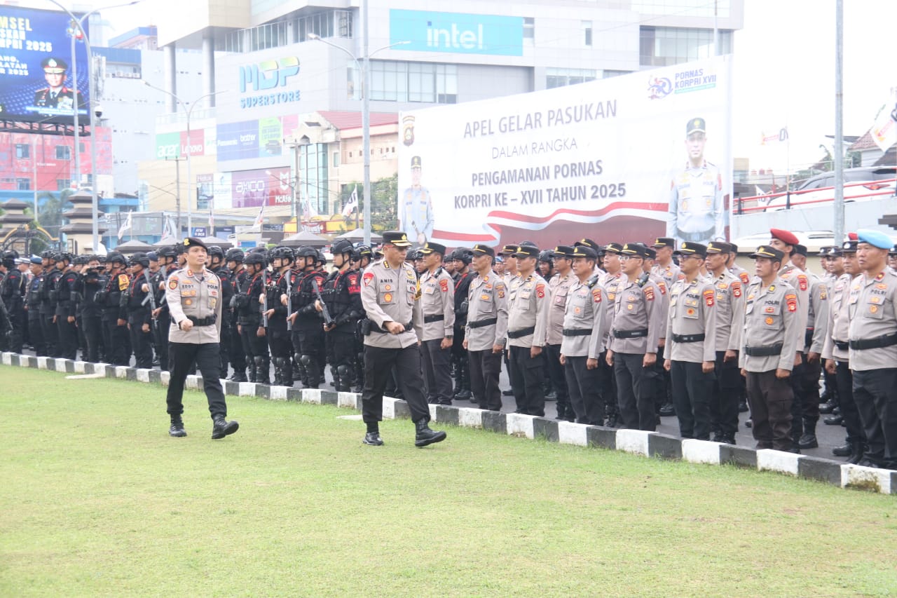 Polda Sumsel menggelar Apel Kesiapan Pengamanan Pornas XVII Korpri yang dipimpin oleh Karo OPS Kombes Pol Muhammad Anis Prasetio santoso yang bertempat di lapangan Gedung utama Presisi Mapolda Sumsel Jalan Jenderal Sudirman KM 4 Palembang, Kamis (2/10/2025) pagi.