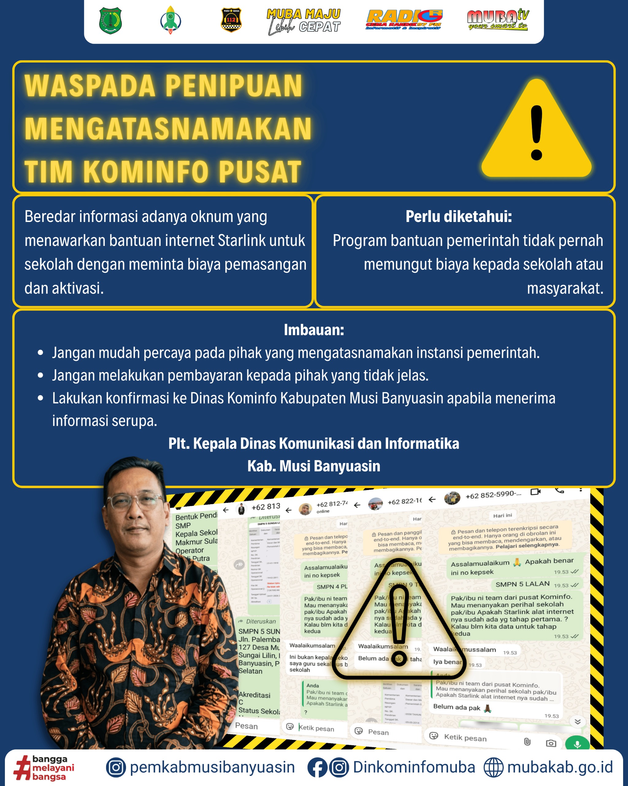 MUBA, SUARAPUBLIK.ID, — Pemerintah Kabupaten Musi Banyuasin melalui Dinas Komunikasi dan Informatika (Kominfo) mengimbau masyarakat, khususnya pihak sekolah untuk meningkatkan kewaspadaan terhadap modus penipuan yang mengatasnamakan tim dari Kementerian Komunikasi dan Digital Republik Indonesia terkait pemberian bantuan perangkat internet satelit Starlink.